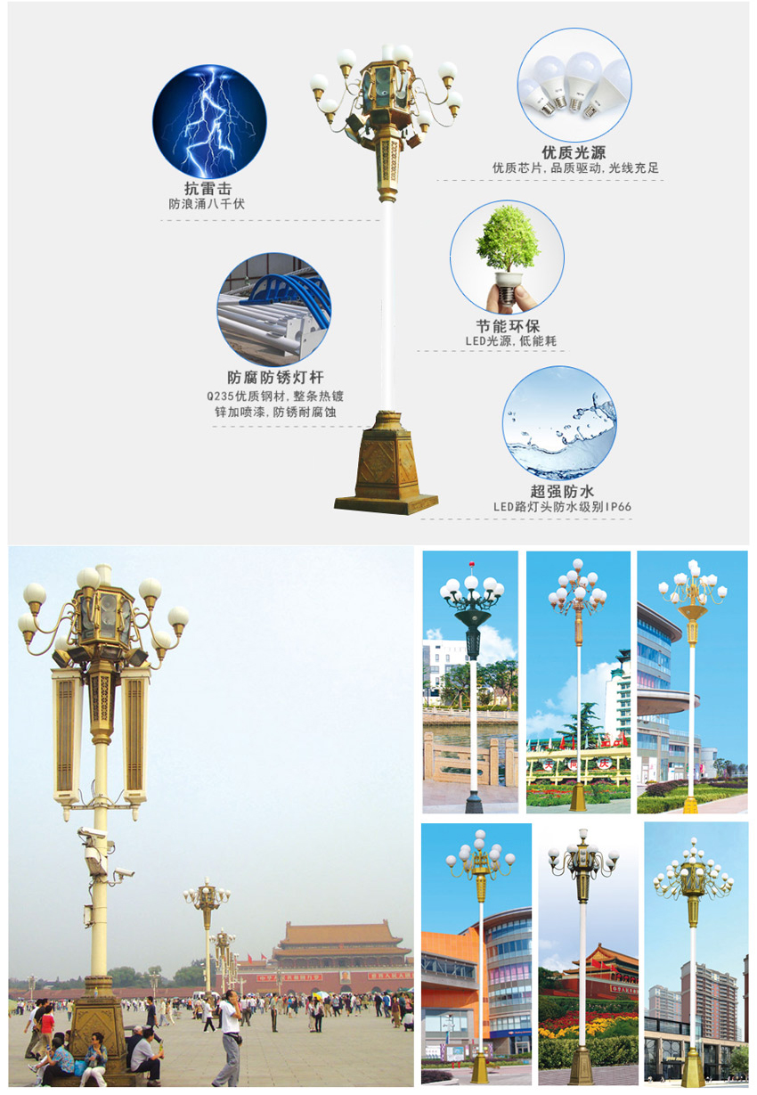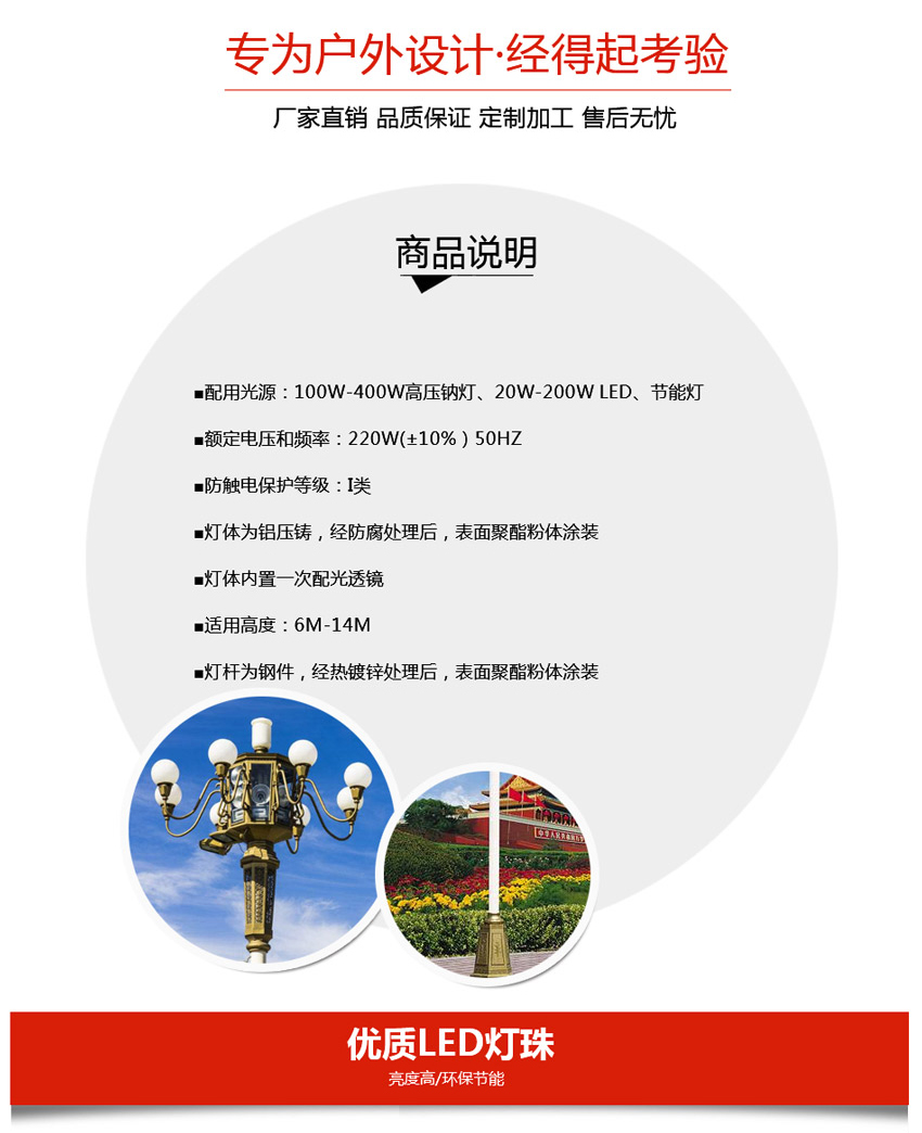 燈桿高度:6~14M,熱鍍鋅桿,外表噴塑處理(可根據(jù)要求設(shè)計) 適配光源:高瓦數(shù)節(jié)能燈、高壓納燈、金鹵燈(壽命長達50000小時,能滿足中華燈分散照明要求 ) 燈頭:可以進行設(shè)計(客戶提供圖紙或者我們提供) 放觸電保護等級: I類 額定電壓和功率:220W(±10%)50HZ 外殼防腐蝕性能:B類 防護等級:IP65 抗風力:30m/s 使用溫度:-40℃~+60℃